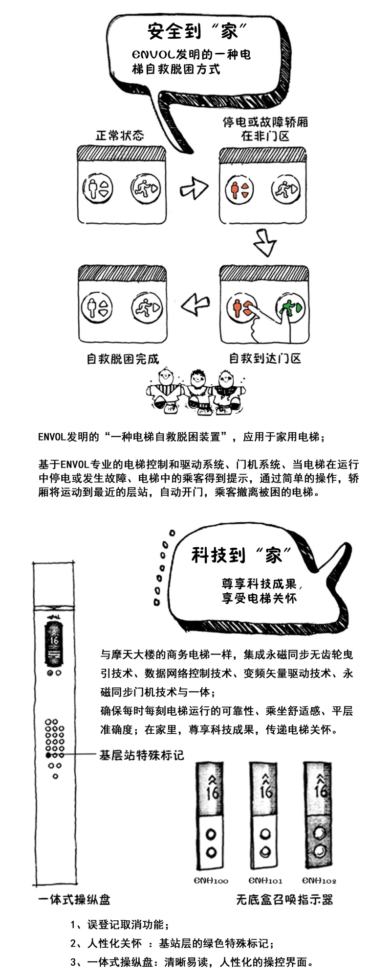 其中值得一提的是,英沃家用電梯(ENH100)專為高檔別墅住宅所設(shè)計(jì),成功應(yīng)用了“電梯自救脫困”的全新技術(shù),實(shí)現(xiàn)“一困就脫”的創(chuàng)新突破?;谟⑽謱I(yè)的電梯控制和驅(qū)動(dòng)系統(tǒng)、門機(jī)系統(tǒng),當(dāng)電梯在運(yùn)行中停電或發(fā)生故障,電梯中的乘客將得到提示,通過簡(jiǎn)單的操作,轎廂將運(yùn)動(dòng)到最近的層站,自動(dòng)開門,乘客撤離被困的電梯。英沃家用電梯的這種新科技完美詮釋了“安全到家”的電梯理念。